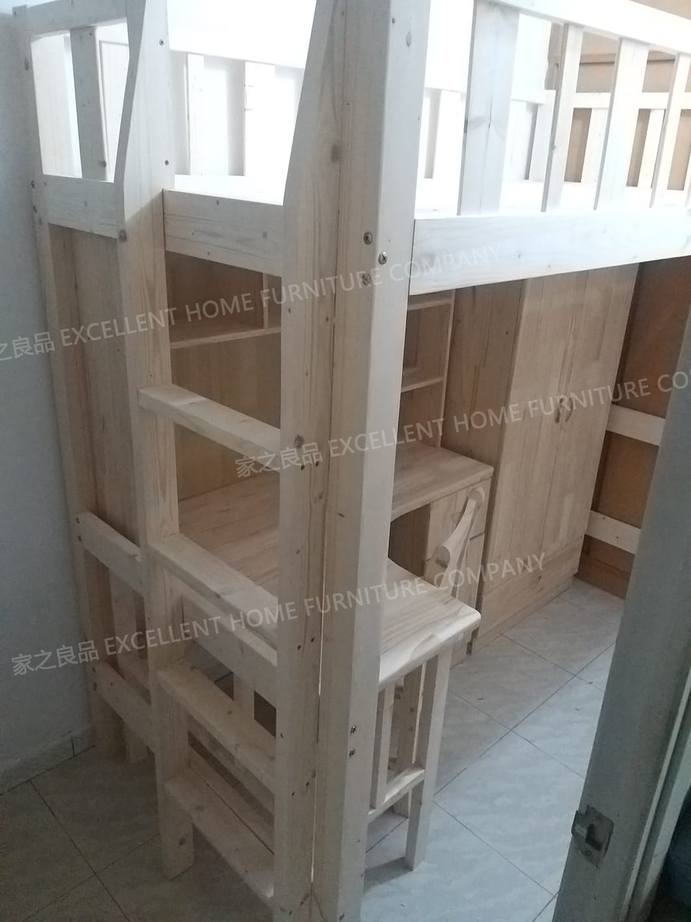 型號:實木高架床swn150 外計:長197*闊102*總高190CM 內計:長183*闊92CM (可用6呎*3呎床褥) *闊邊直梯(4號直梯) 單床架售價:$2580 *加衣櫃:+$1300(安裝費+$150) 衣櫃擺正望床架右邊:闊70*深42*高148cm *加寫字枱:+$1500(安裝費+$150) 書枱擺正望床架左邊:闊113cm*深45cm*高148cm 價錢:$5380