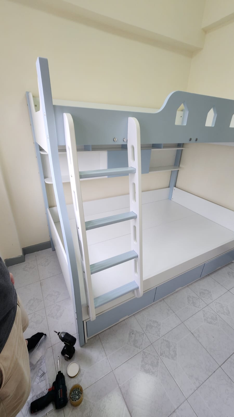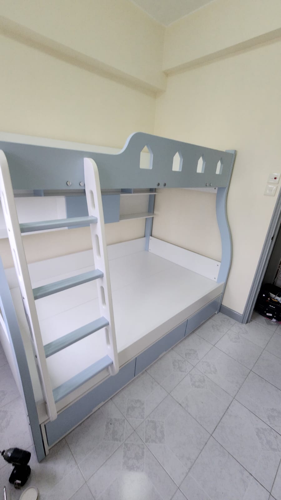 訂單日期:2023-10-10 雙層床swb169 總高標準為170CM 尺寸: 外計:長198*闊128(下床) 內計:長190*闊100(上床)*闊120(下床) *淺藍色 *樓梯在正望床左邊 價錢:$4880(固定三櫃桶款)