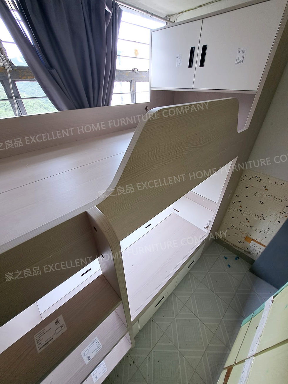 (下床床面高50cm,下格床櫃體下面留40cm放床褥) (內徑尺寸即係床褥尺寸) 內計:長193*闊91cm(上床) (內計為床褥尺寸位置) 材質:E1密度板 顏色:波兰橡木 衣櫃在正望床右邊,梯在正望床左邊(梯不做落地) 下格床做3個櫃桶