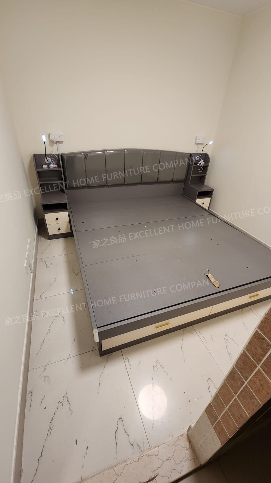 尺寸2: 外計:長205.5*闊185*高100cm 內計:長200*闊180cm 顏色:灰布紋+卡其色+仿皮軟包(/深灰色 ) 售價:$3080 *加2個床頭櫃:$1000 床合計:$4080 -----------------