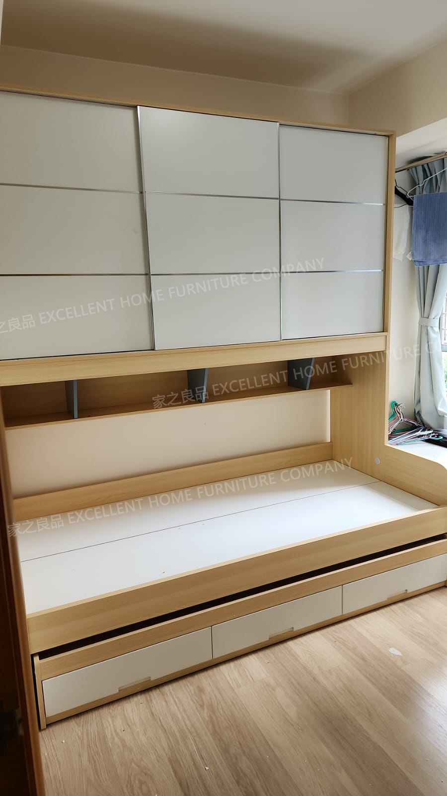 尺寸: 外計:長196*闊97*總高220cm 內計:長190*闊90cm (內計尺寸即係床褥尺寸) *顏色:原木色拼白色 *按標準內部格局 *款式:三櫃桶子床 +$1000 拖床尺寸:外計:長190cm*闊96cm*高27cm 拖床內計:長185cm*闊90cm 價錢:$5380 -----------------